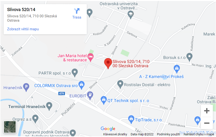 Sídlo: Ostrava – Slezská Ostrava, Slívova 520/14, PSČ 71000